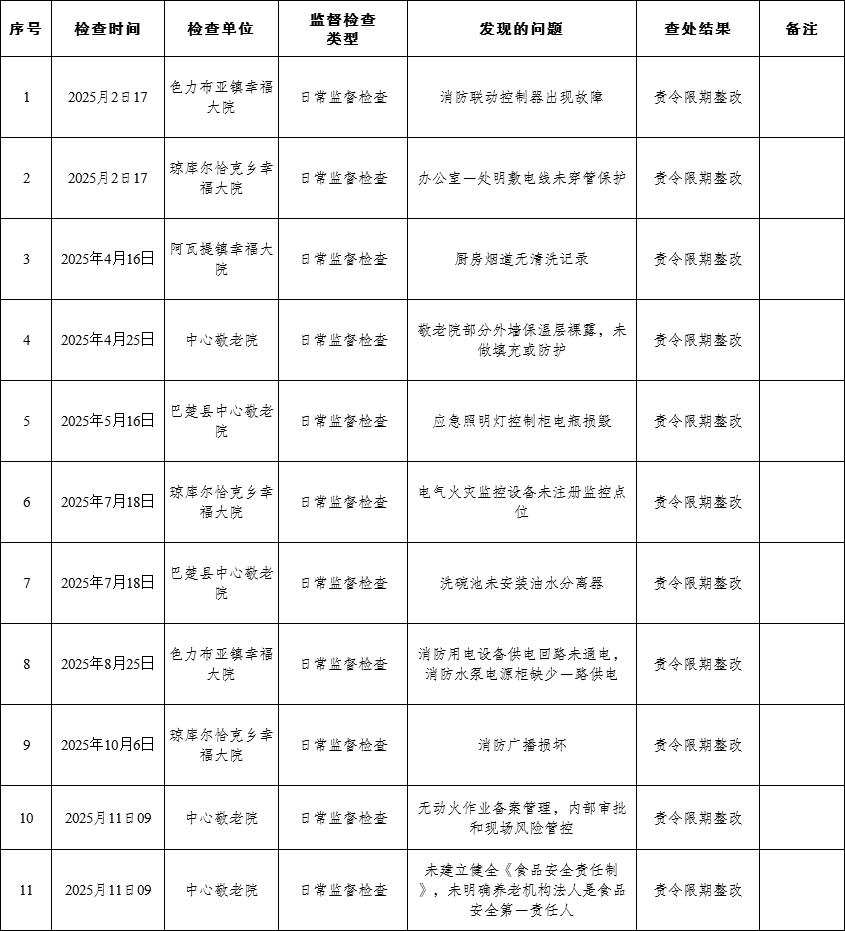巴楚县2025年养老机构监督检查抽查情况及处理结果公示
