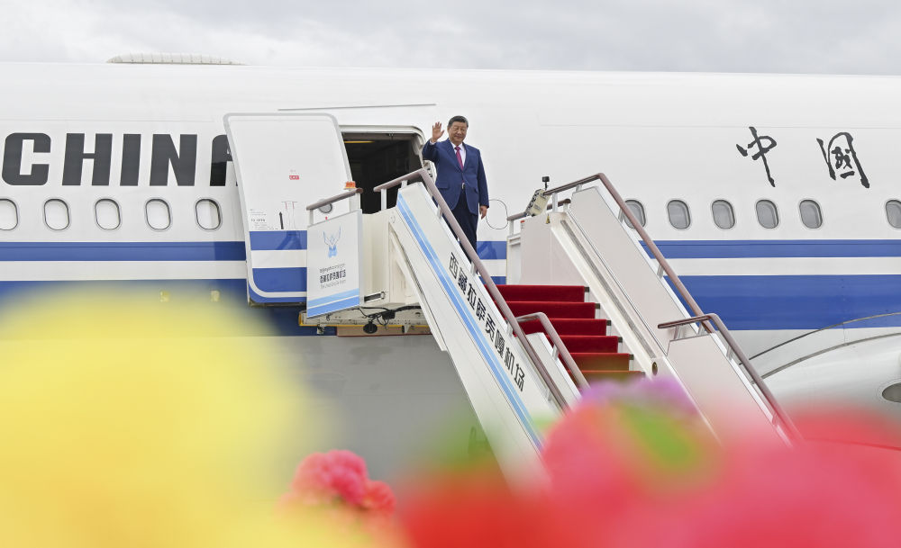 12时许,习近平乘坐的专机在贡嘎机场降落,等候在停机坪的西藏各族各界群众热烈欢呼。习近平走出舱门,向欢迎群众挥手致意。