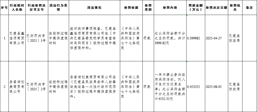 巴楚县财政局2025年行政处罚信息公示