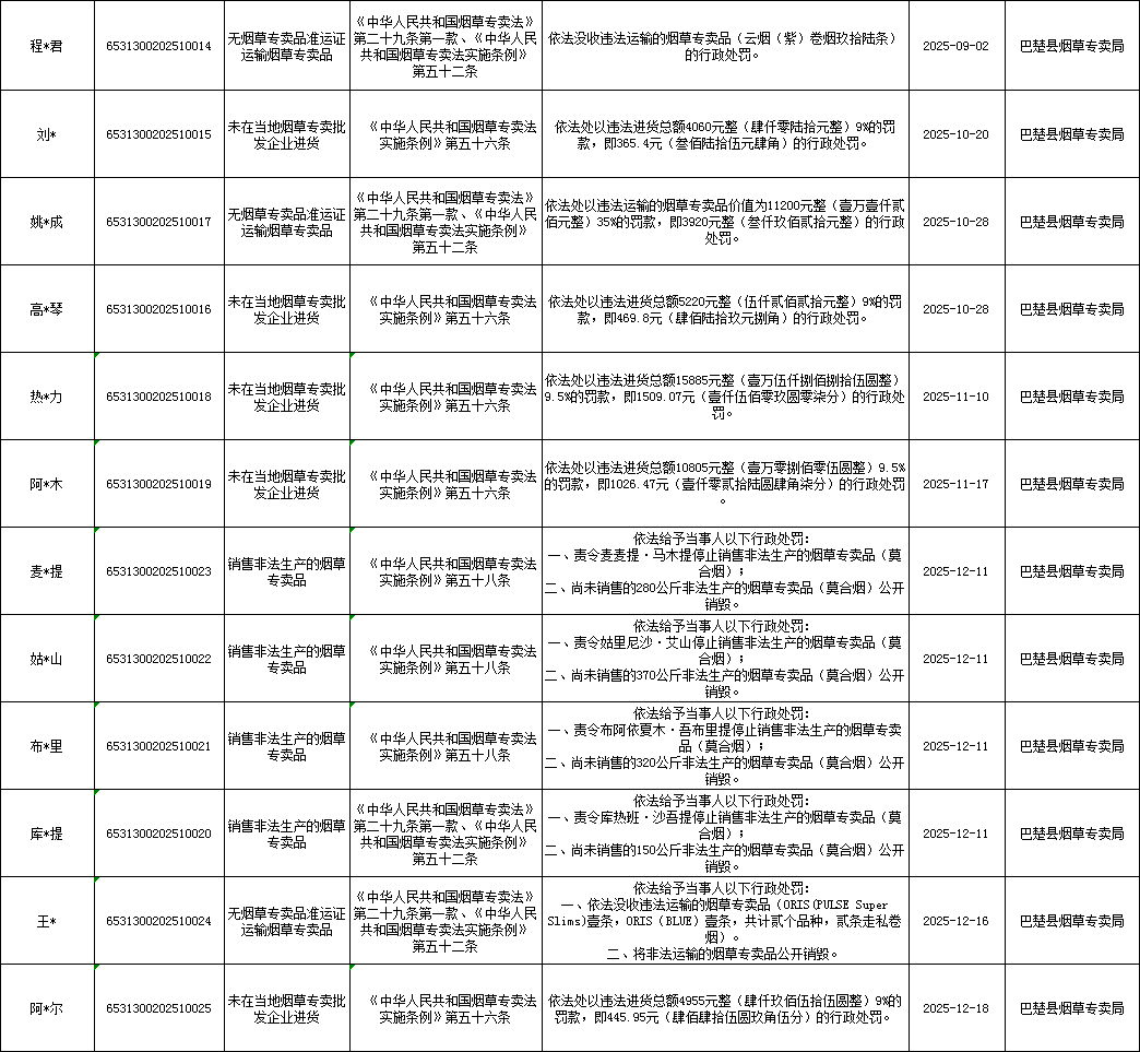 巴楚县烟草专卖局2025年下半年行政处罚公示