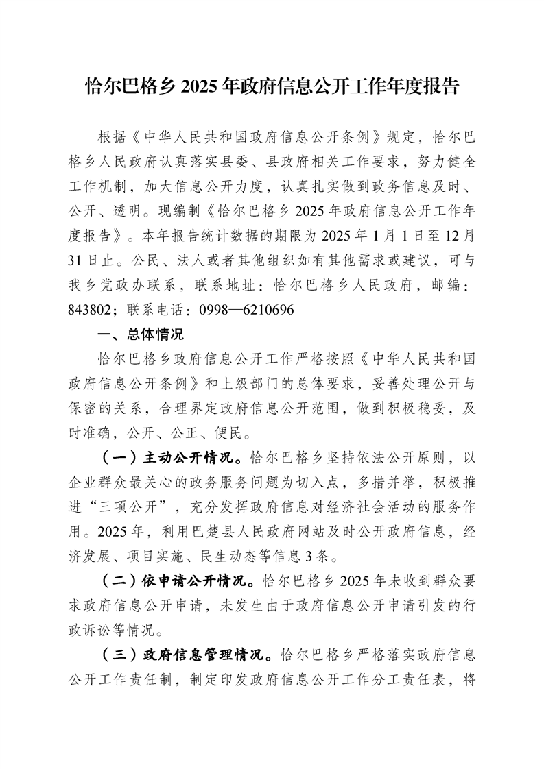 恰尔巴格乡2025年政府信息公开工作年度报告