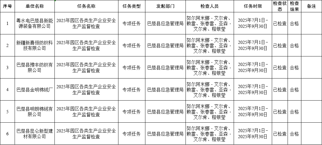 巴楚县应急管理局开展2025年园区各类生产企业“双随机、一公开”任务监督抽查结果
